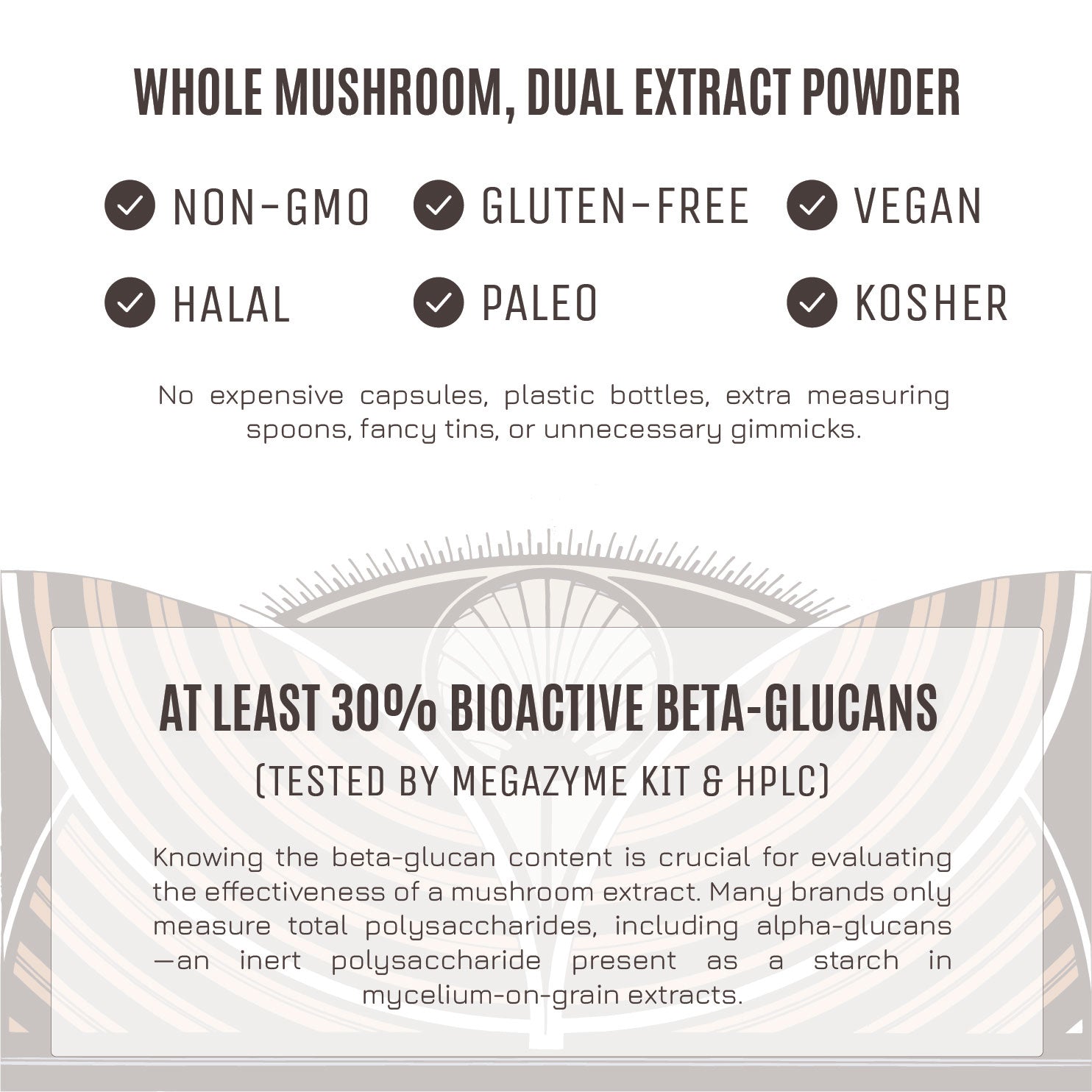 #1 - it is it is an excellent product. The powder is super-fine and dissolves in water almost like instant coffee with no gritty residue. We get all the benefits of dual extraction plus the benefits of the actual mushroom body in the powdered format. Certified organic and third party lab tested for beta glucan-levels.