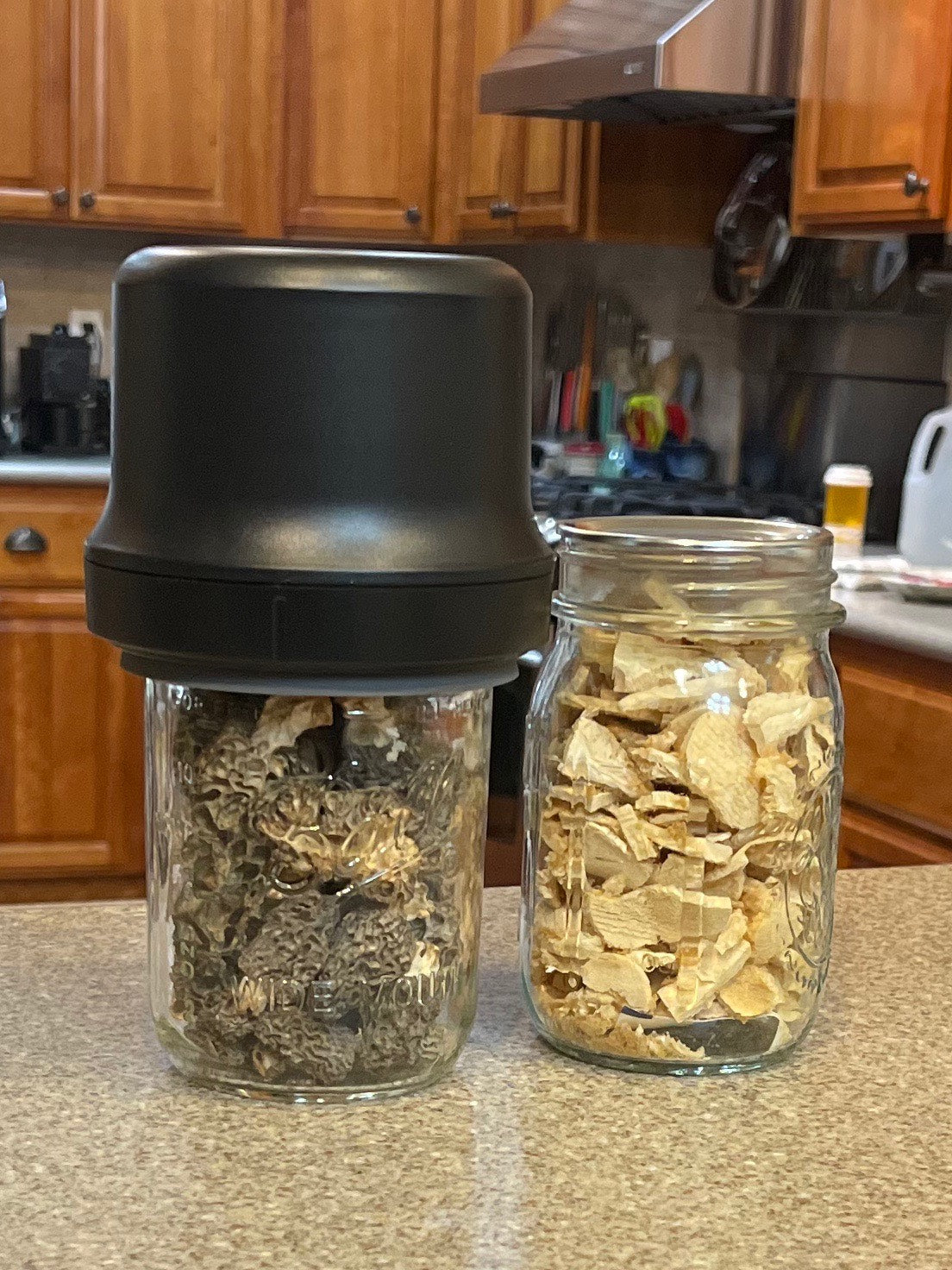 We love to vacuum seal our mason jars! Specifically, after we pack a jar full of dried or freeze-dried mushrooms, we like add a dessicant pack and then vacuum seal the lid to remove the air and mitigate the oxydization for long-term storage.